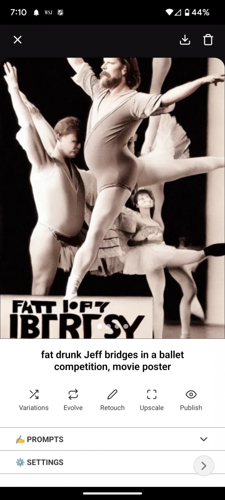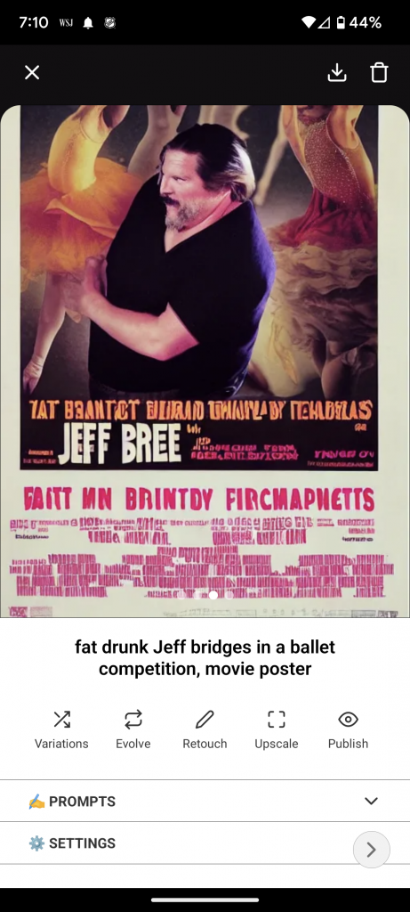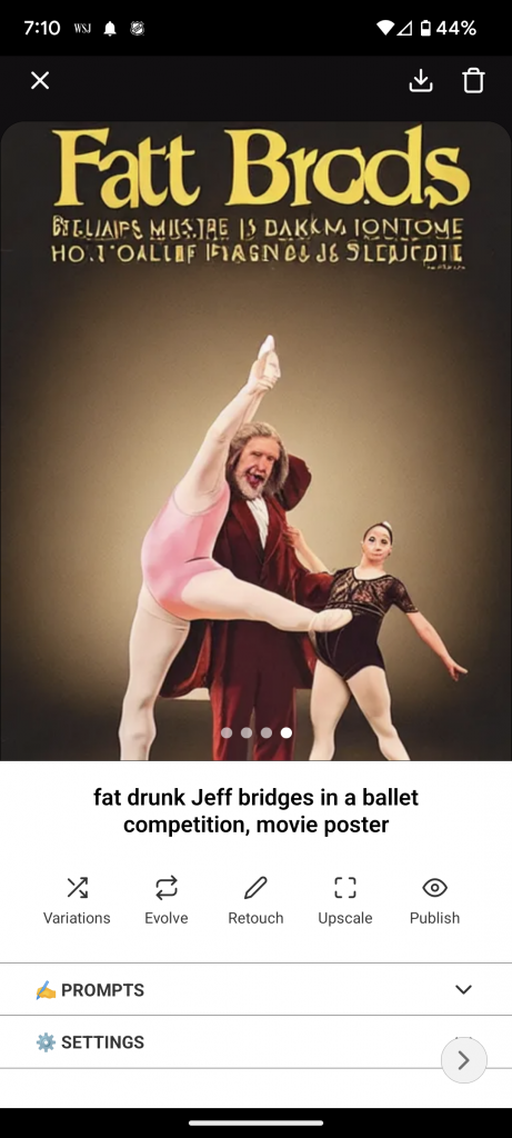 Ballet Bridges mryug February 19, 2023 Leave a Comment on Ballet Bridges Posted in Movie Posters Prompt: Fat drunk Jeff Bridges in a ballet competition, movie poster Author: mryug