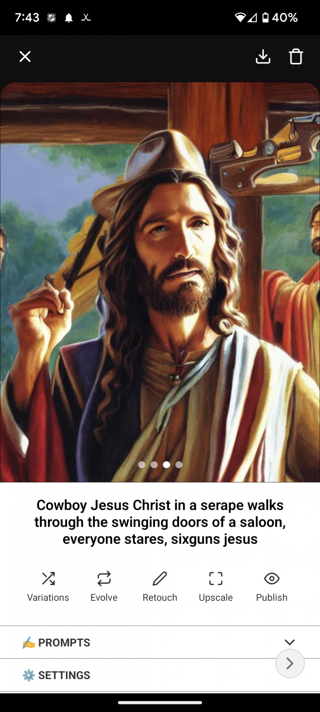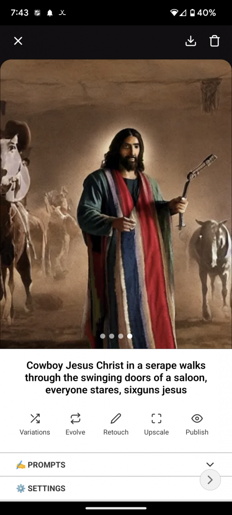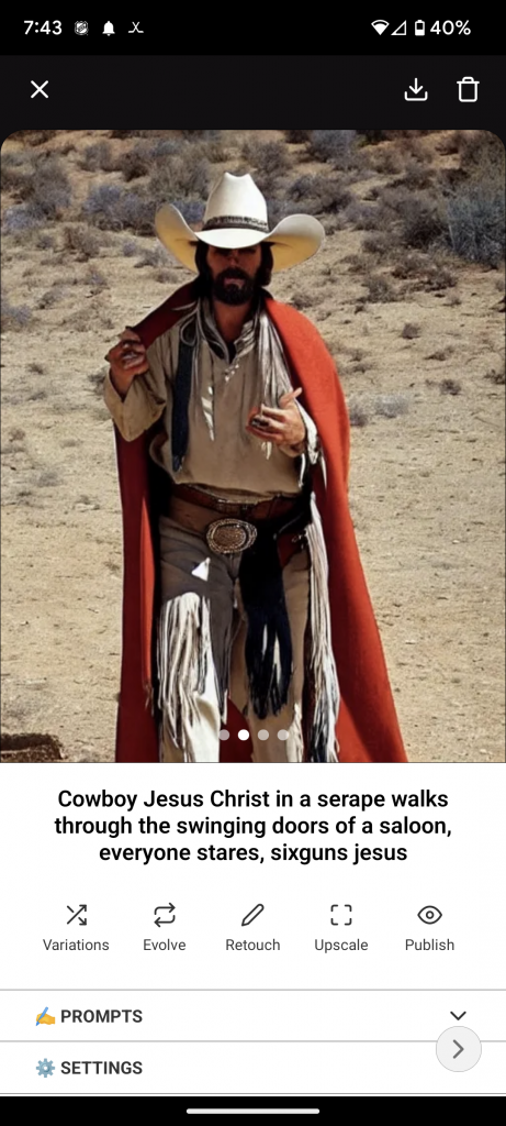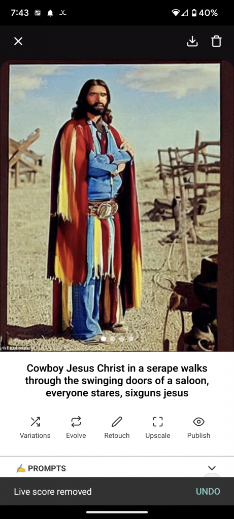 Yeeha yahweh mryug February 19, 2023 Leave a Comment on Yeeha yahweh Posted in Adventures in Sacrilege Prompt Cowboy Jesus Christ in a serape walks through the swinging doors of a saloon, everyone stares, sixguns jesus Author: mryug